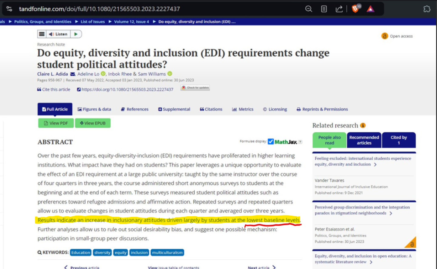 It should be noted that the authors change “DEI” to “EDI” for no apparent reason…perhaps to escape scrutiny? In any case, the four authors say the quiet part out loud in the abstract, when they report the results of studying the effects of required DEI/EDI courses on University students indicated that “an increase in inclusionary attitudes driven largely by students at the lowest baseline levels.” The authors administered surveys to their captives, over time, and determined that the” lowest baseline levels of students” were most susceptible to being indoctrinated.