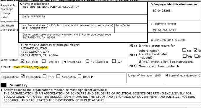 The address listed for WPSA in the most recent IRS filing was the home address of the executive director, Richard Cuclas and the now defunct official website was a child page of the California State University Sacramento webpage. , Clucas himself was a professor at CSUS before moving on to Portland, Oregon, according to WPSA minutes discussing how to get around legal requirements to change the official address (since Clucas had moved out of State).